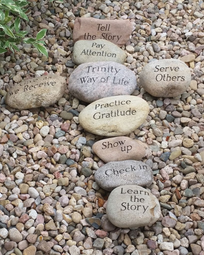 *As of 2018 the Trinity Way of Life included Pay Attention (prayer), Show Up (community), Serve Others (service), Learn the Story (study), Give as you receive (generosity), Check In (accountability), Practice Gratitude (thankfulness), and Tell the story (witness).